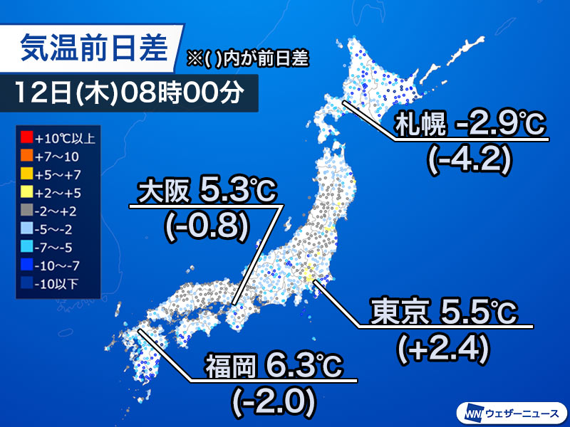 今日12日(木)の朝は各地で昨日より冷え込んだ朝となっています。8時現在で札幌は前日の同時刻より4.2℃下がり、-2.9℃と厳しい寒さ、新潟や福岡でも2.0℃近く気温が下がり、新潟1.3℃、福岡6.3℃となっています。