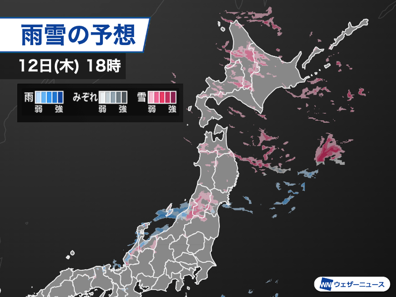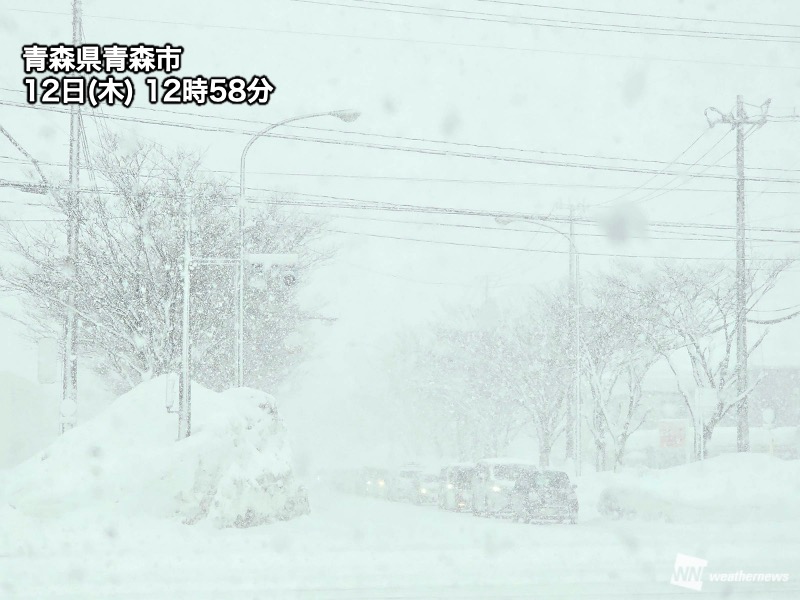 特に、北海道は留萌市〜旭川市付近、東北は青森県の津軽半島〜下北半島付近で雪が強まっています。活発な雪雲の下では1時間に4cm前後の雪を観測中です。13時までの6時間降雪量(雪の強さに相当)は、青森市で11cm、北海道上川町層雲峡で12cmとなりました。