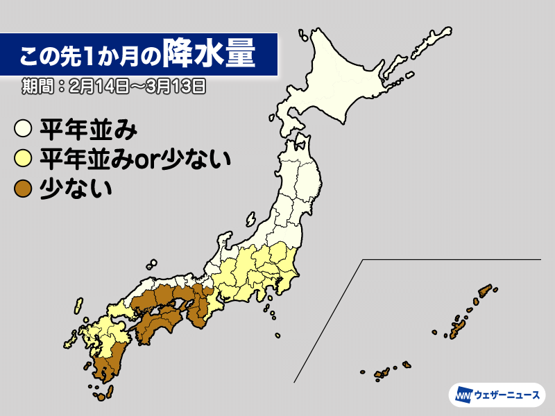 高気圧に覆われやすい関東から西の降水量は、西日本太平洋側や沖縄・奄美で平年より少なく、東日本太平洋側と九州北部で平年並みか少ない見通しです。