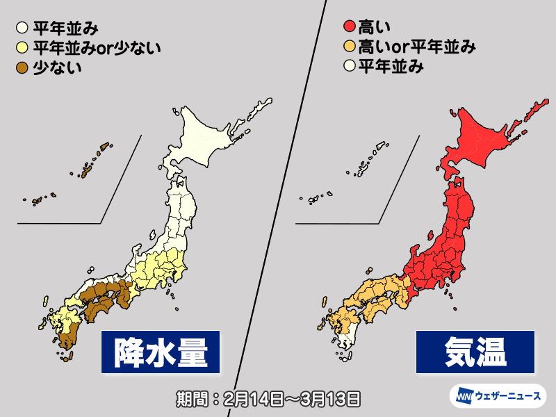 今日12日(木)、気象庁は2月14日から3月13日までの1か月予報を発表しました。この先は寒気の影響を受けにくく、気温が高めになって春を感じる日が増えていく見込みです。太平洋側の水不足が解消する可能性は低い見通しになっています。