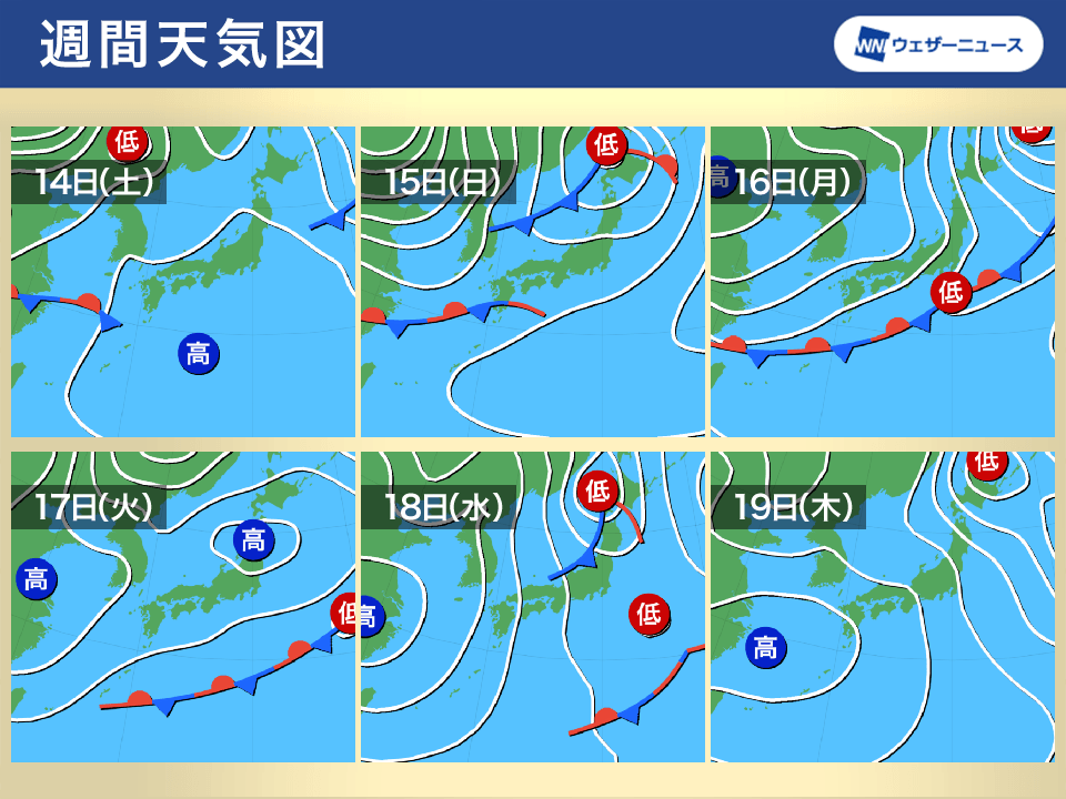週明け16日(月)にかけては、一時的に冬型の気圧配置へ移行する見込みです。寒気が再び南下し、北日本の日本海側を中心に雪や雨の降る空に戻ります。西日本の太平洋側でも、南岸の前線の影響で雨の降るところがある見通しです。
