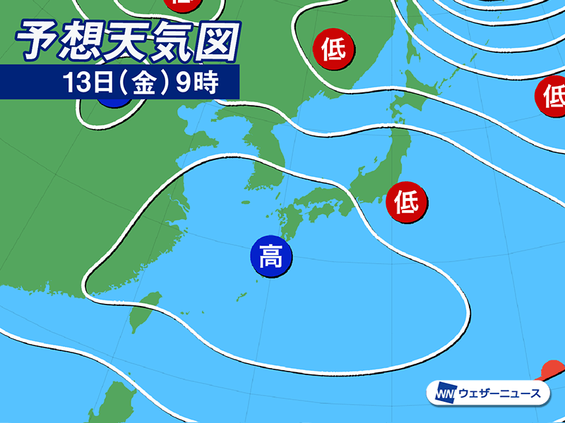 明日13日(金)の西日本・東日本は広い範囲で晴れて穏やかな天気になります。日向では暖かく感じられそうです。北日本も雪や雨は一旦落ち着きますが、すぐに天気は下り坂となります。雪かきは早めに行ってください