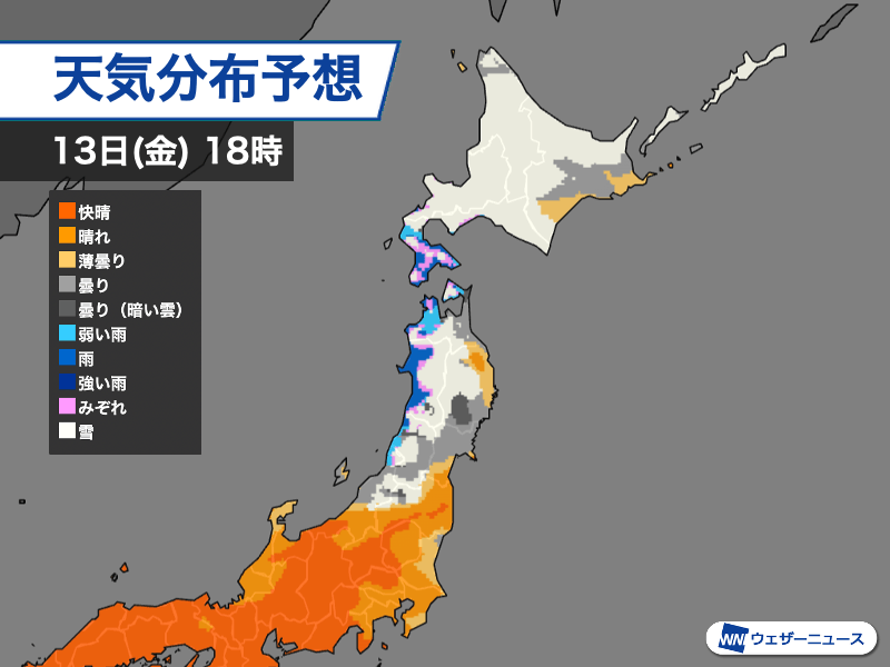 高気圧が西から張り出し、冬型の気圧配置は緩んでいます。北海道は西からの雲が流れ込みやすい道北や道央の空知・後志地方、道南の渡島半島で雪の降っている所がありますが、昨日12日(木)に比べると降り方は落ち着いている状況です。