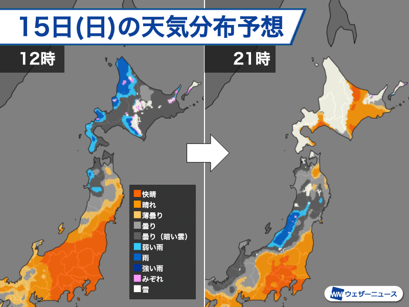 東日本・西日本は太平洋側を中心に日差しが届きますが、週明けは気温が大幅に下がります。体感の変化に注意して、体調管理をしっかりと行ってください。