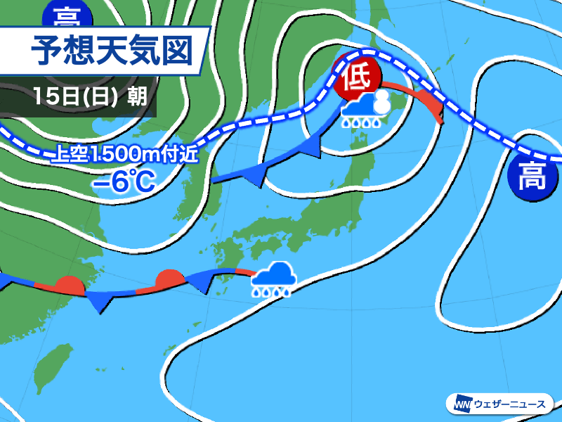 低気圧に向かって南から暖かな空気が流れ込むため、北海道も昼間はプラスの気温の所が多くなります。平野部では雨やみぞれに、山沿いでも湿った雪になる予想です。融雪が進むため、路面状態の悪化や屋根からの落雪、山間部は雪崩に注意をしてください。