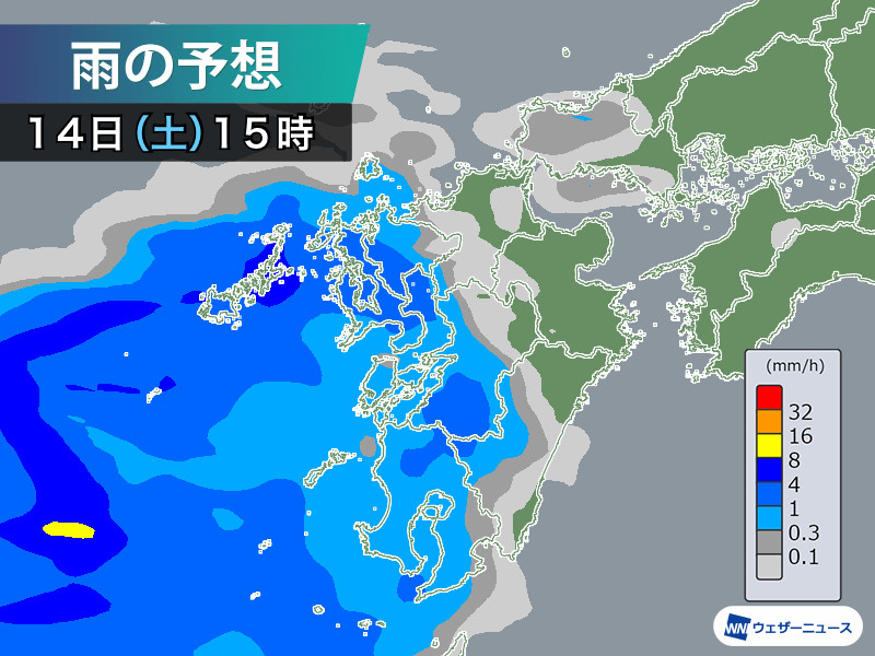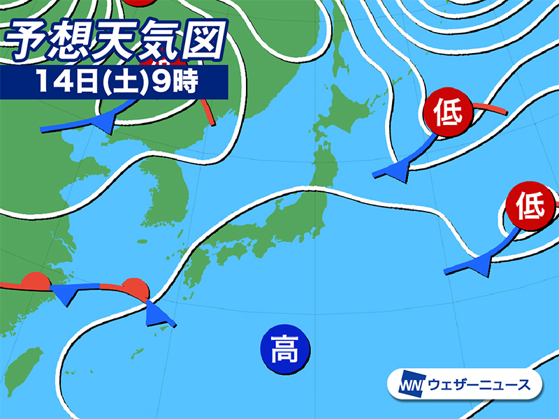 南西からは暖かな空気が流れ込み、気温は昨日13日(金)よりさらに上がる見込みです。特に関東から西の地域は最高気温が15℃以上になるところが多く、上着なしでも過ごせるくらいになります。