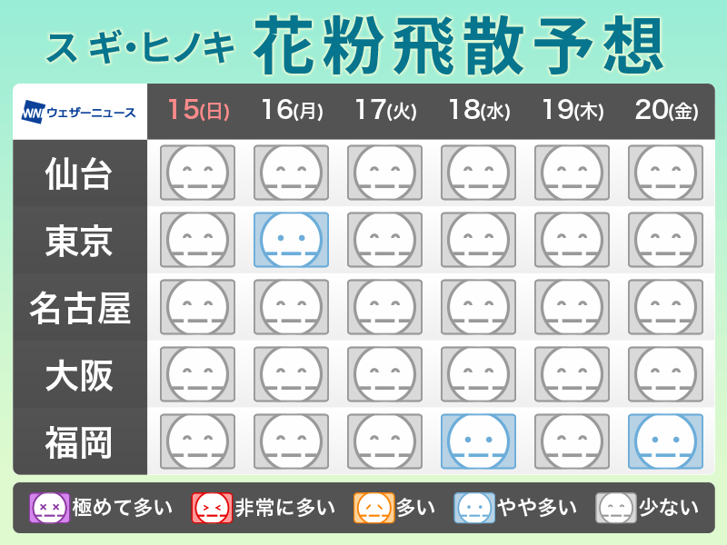 風が強い日や暖かい日、雨上がりなどは予想より飛散量が増える可能性があります。