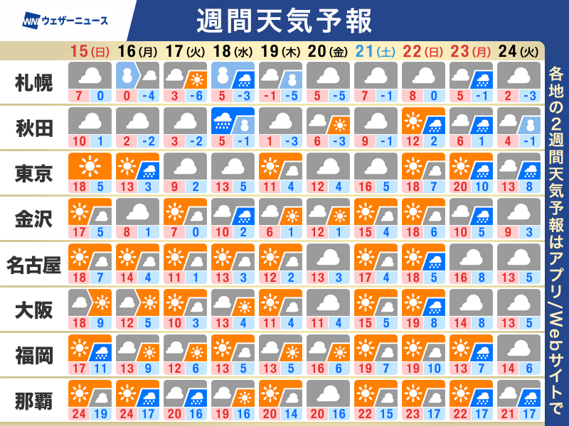 北日本でも気温が平年より高い日があり、来週末は東北で10℃以上のところが多くなりそうです。積雪のある地域では、屋根からの落雪や雪崩などに注意が必要です。