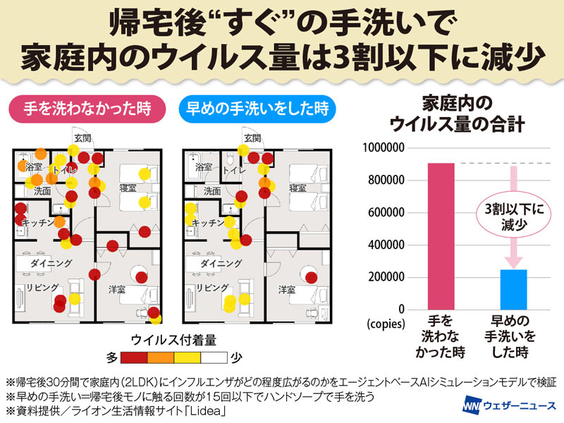 その結果、『早めに手洗いをした時』は、『手を洗わなかった時』に比べて、家庭内のウイルス量が3割以下に抑えられることがわかったのです」(浅野さん)