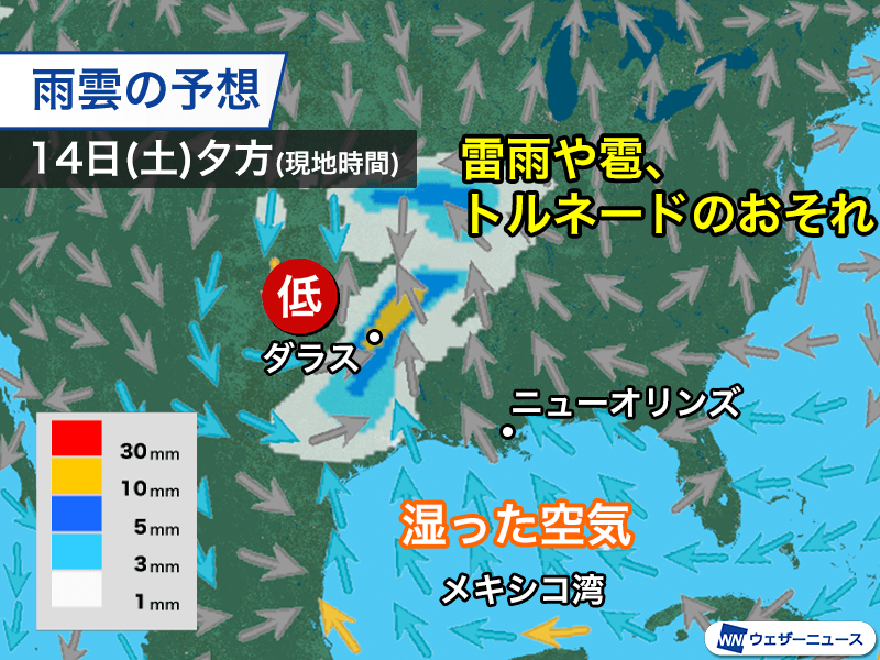 雨雲の帯は移動していて、今後はテキサス州の東部からルイジアナ州、ミシシッピ州へと進んでいく見込みです。