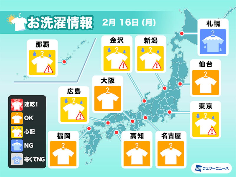 一方、東北の太平洋側や東海は晴れて外干しのチャンスとなります。ただ、北寄り風がやや強まる見込みで、洗濯物が飛ばされないようしっかり固定するなどの対策が必要です。近畿は雲が多めながら、外干しはおおむね問題ないとみています。