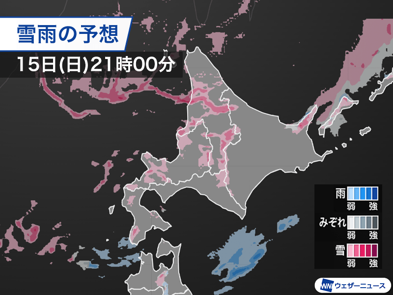 今日15日(日)の北海道は低気圧や前線の影響で午後になり雨が降り出してきました。路面状況が非常に悪くなっていますので、足元に注意が必要です。