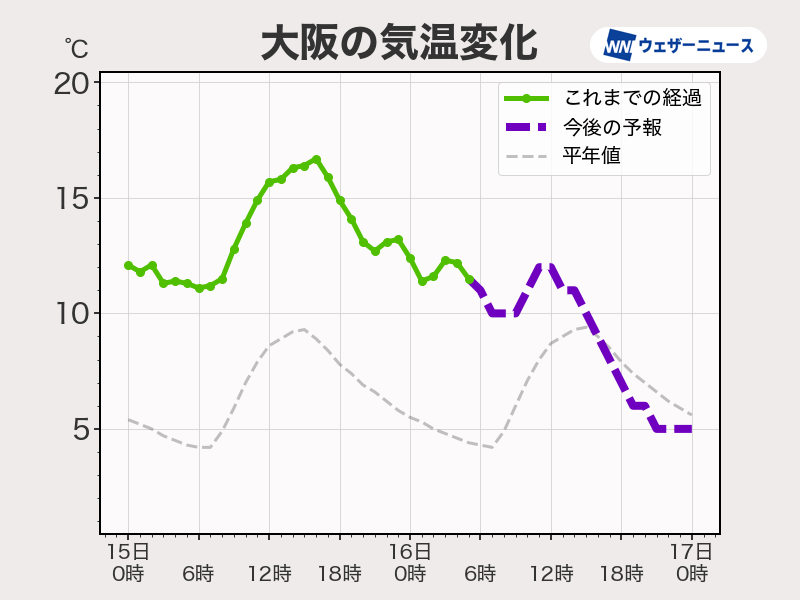 暖気から寒気に入れ替わるため、昼間の気温は昨日ほどは上がりません。それでも九州南部や四国太平洋側は15℃を上回り、過ごしやすい陽気です。