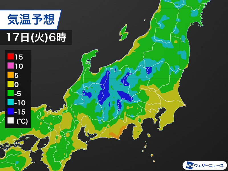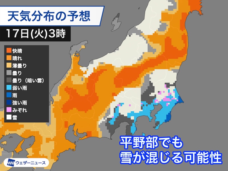 内陸部や山沿いでは、深夜から未明にかけて雪になるタイミングがあり、秩父や奥多摩など気温の低い山間部では積もる所がある見込みです。