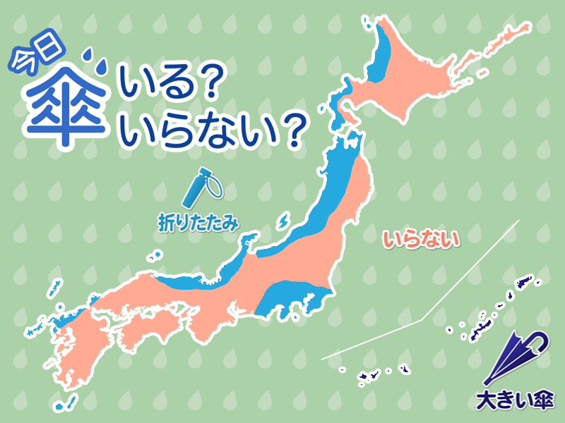 北日本の日本海側は一部で雪の降ることがあり、北陸西部から山陰東部でもにわか雨があります。心配な方は折りたたみ傘をお持ちください。