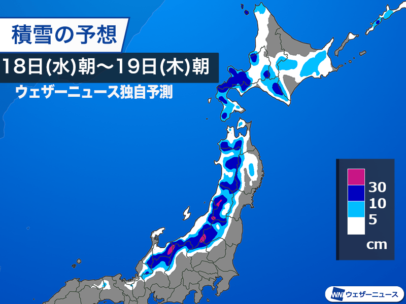明日19日(木)の朝には、平地で雪の目安とされる上空約1500mで−6℃以下の寒気が近畿から関東付近まで南下する見込みです。このため、夜には北陸でも雨から雪に変わってきます。