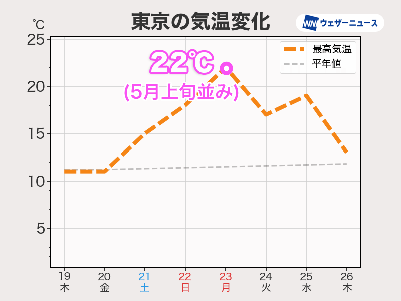 目先は気温が平年並みのところが多いですが、三連休後半にかけてグッと気温が上がります。特に三連休後半は全国的に再び4月並の暖かさで、20℃を上回るところもある予想です。
