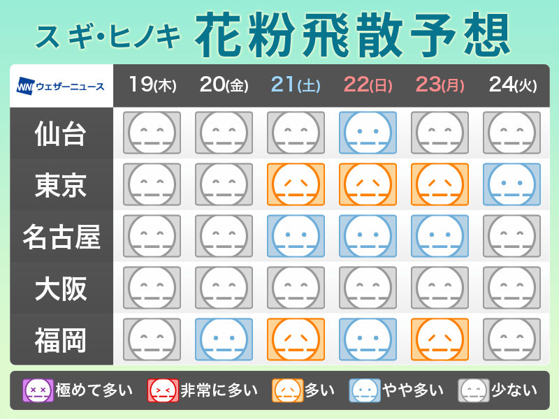 関東などスギ花粉の飛散が始まっているところが増えてきました。週末の気温上昇に伴って一気に本格的な飛散となる可能性もあるため、花粉症の症状がある方はお気を付けください。