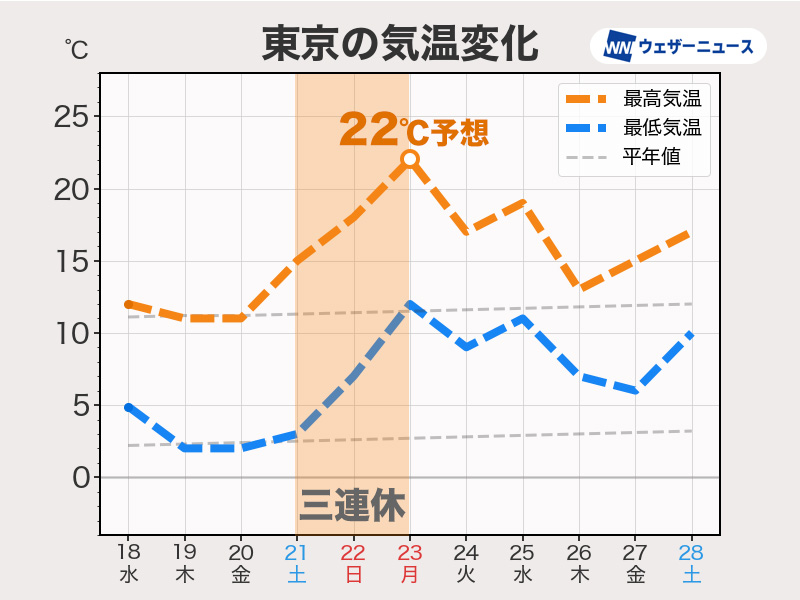 西日本や東日本では局地的に20℃を超えて今年一番の暖かさになる予想で、東京でも22日(日)に18℃、23日(月)に22℃まで気温が上がる見込みとなっています。