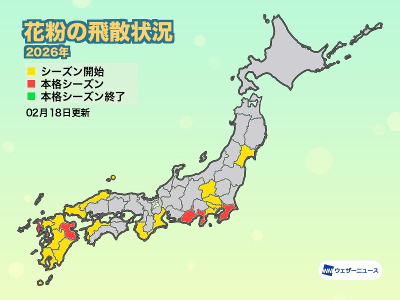 先週末に上空の暖気北上にともない気温が上昇して以降、西日本や東日本を中心にスギ花粉の飛散エリアが広がっています。ウェザーニュースによる解析では今日18日(水)までに東京を含む1都18県で花粉シーズンが開始済。千葉、静岡、大分、長崎では既に本格飛散シーズンに入っているとみています。この後も飛散エリアはさらに拡大する見込みです。