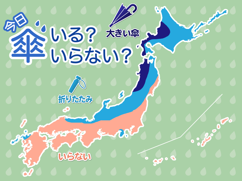 北陸から近畿北部、山陰にかけては昼頃まで雪の降るところがあり、折りたたみ傘があると安心です。