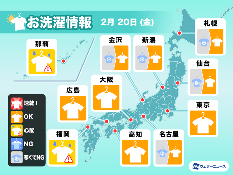 ただ、西日本は雲が目立ちにわか雨の降る時間もありそうです。また、北海道や東北北部でもにわか雨やにわか雪の可能性があります。在宅できない場合は室内干しをおすすめします。