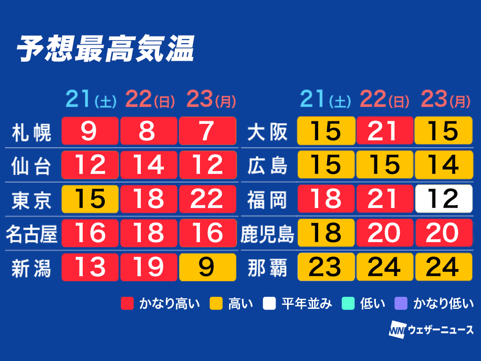 連休初日の明日21日(土)は関東以西で15℃を超える所が多い予想となっています。明後日22日(日)は広い範囲でピークとなり、平年よりも「かなり高い」気温です。福岡市や大阪市は21℃、新潟市でも19℃まで上がるとみられます。