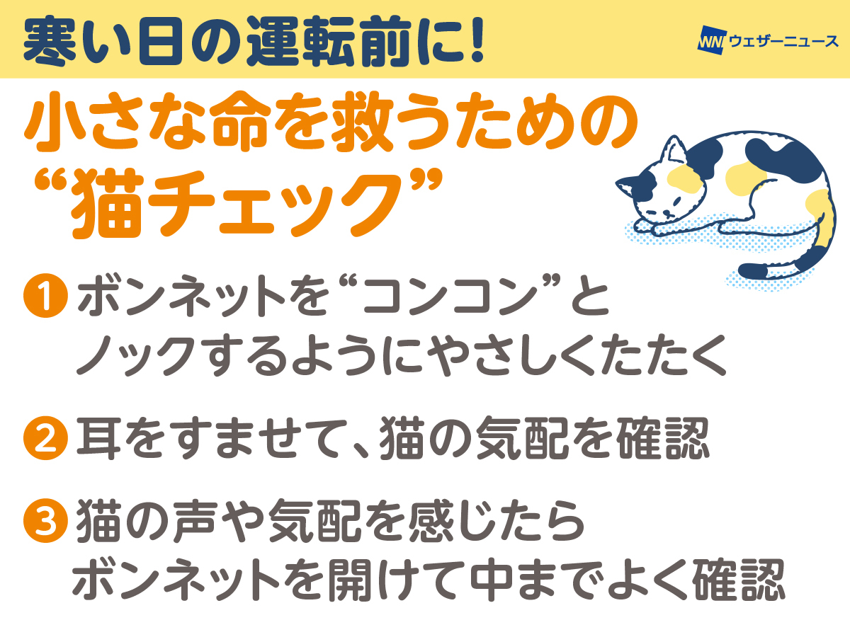 2月22日は「ニャン・ニャンニャン」の語呂合わせから、日本では1987年に「猫の日」と定められています。一方でこの日の前後は、年間で最も寒い時季にあたり、猫が暖をとろうとしてエンジンルームに入り込んでしまう可能性も高まります。
