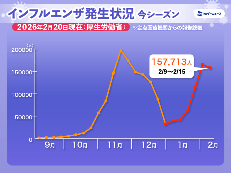 インフルエンザ患者数 前週より微減も15万人超が継続