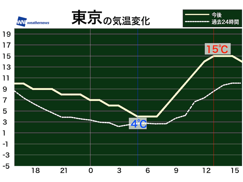 昼間は気温が上昇し、15℃くらいまで上がりそうです。