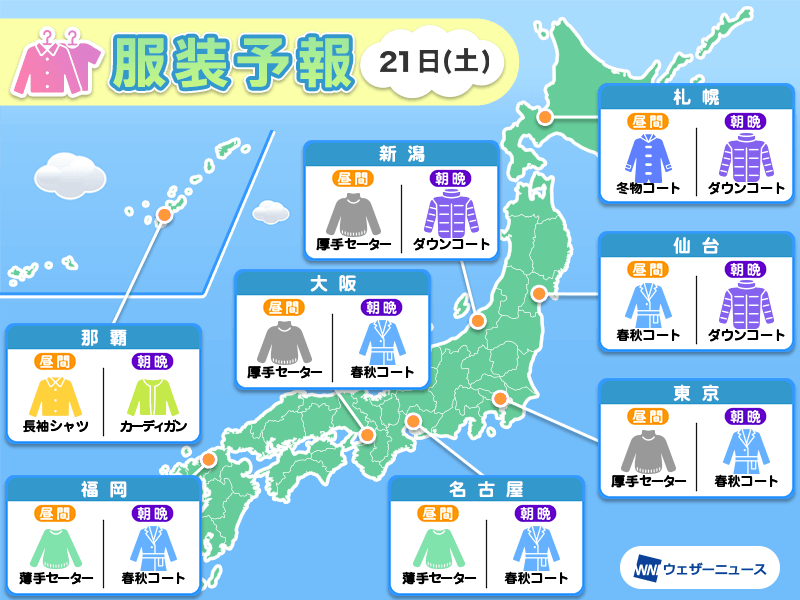 今日と明日の気温変化を比較して、気温に適した服装をご提案します。ウェザーニュースの服装予報もご活用ください。