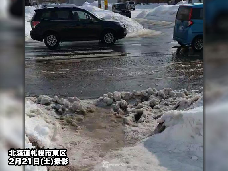 札幌では2月15日(日)に観測した5.8℃を上回って今年最も高い気温となっています。上空の寒気が離れた北海道では気温の上昇が顕著で前日より10℃以上気温が高くなっている地点があります。