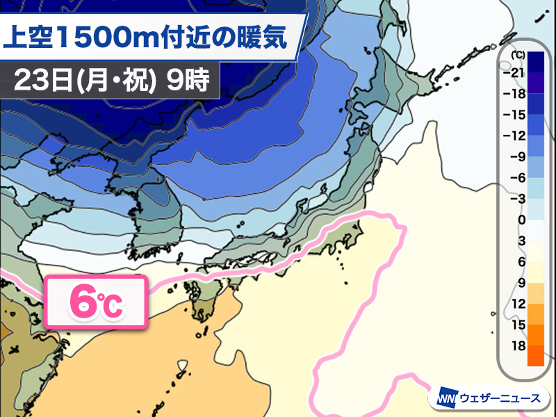 前線通過後の明後日23日(月)になると、北日本には一時的に上空の寒気が流れ込む一方、西日本や東日本太平洋側には暖気の影響が残り、季節先取りの暖かさが続く予想です。