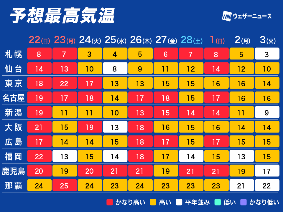 東京の予想最高気温は5月上旬並みの22℃で、今年一番の暖かさになるとみています。
