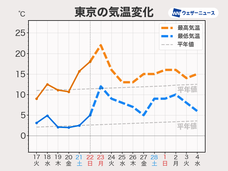 この先一週間程度、上空約1,500mの気温が平年のこの時期より4〜10℃ほど高い状態が続く見通しとなっています。地上の気温も3〜4月並みの状況が続く見込みです。