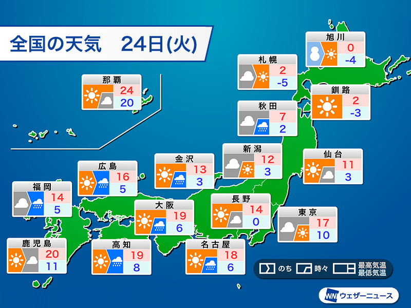 明日24日(火)は上空1500m付近で−6℃以下の寒気に覆われる北海道や東北北部を中心に寒さが戻ります。最低気温は札幌市で−5℃まで冷え込み、最高気温も2℃までしか上がらない予想です。