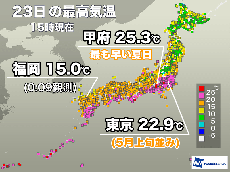 山梨県甲府は最も早い夏日を観測 東京都心は5月上旬並みの陽気