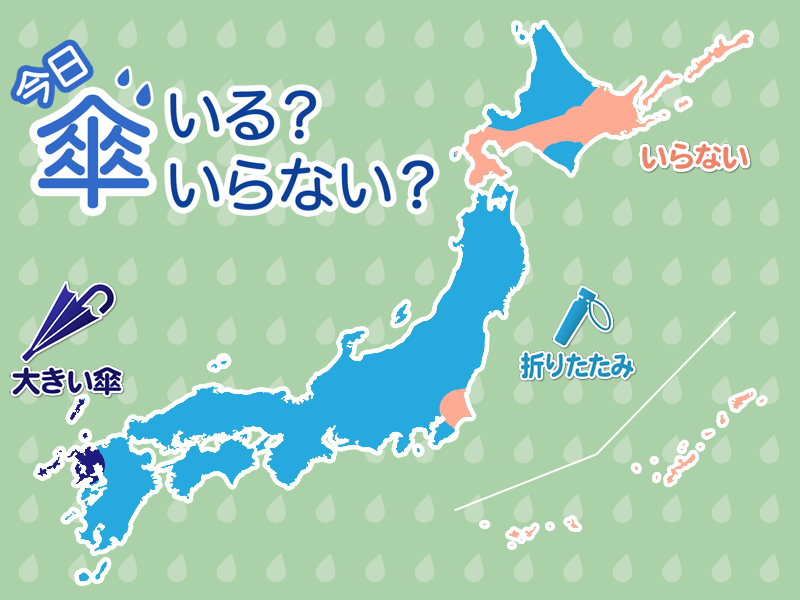 北海道の日本海側や東北も雨や雪の降るところがあるため、外出には折りたたみ傘が役立ちそうです。