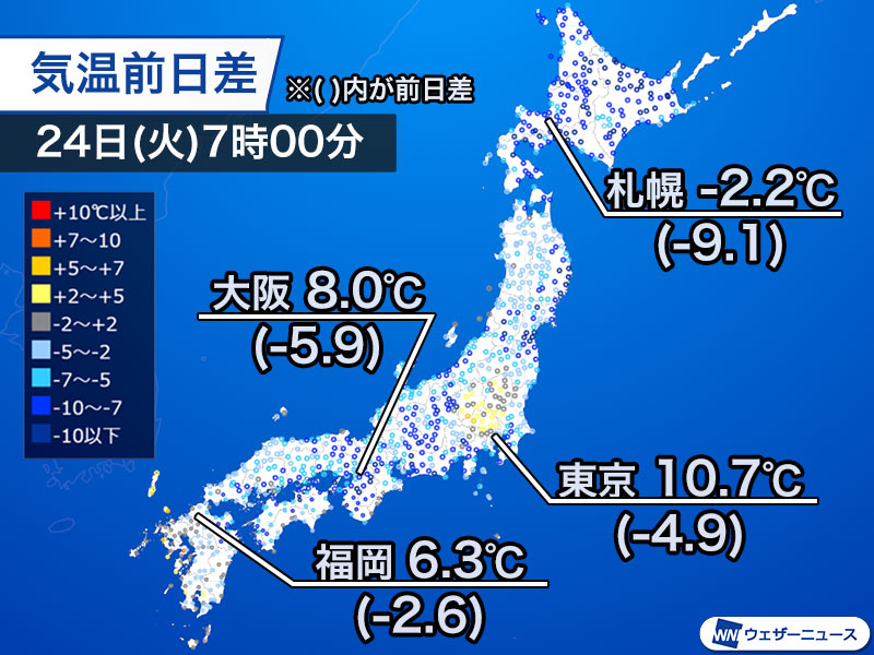 札幌は−2.2℃と、昨日より9℃以上低くなっています。仙台は3.4℃、東京は10.7℃、名古屋は7.1℃で、いずれも昨日の同時刻より5℃前後低下しました。大阪は8.0℃、福岡は6.3℃と、西日本でも気温が下がっています。