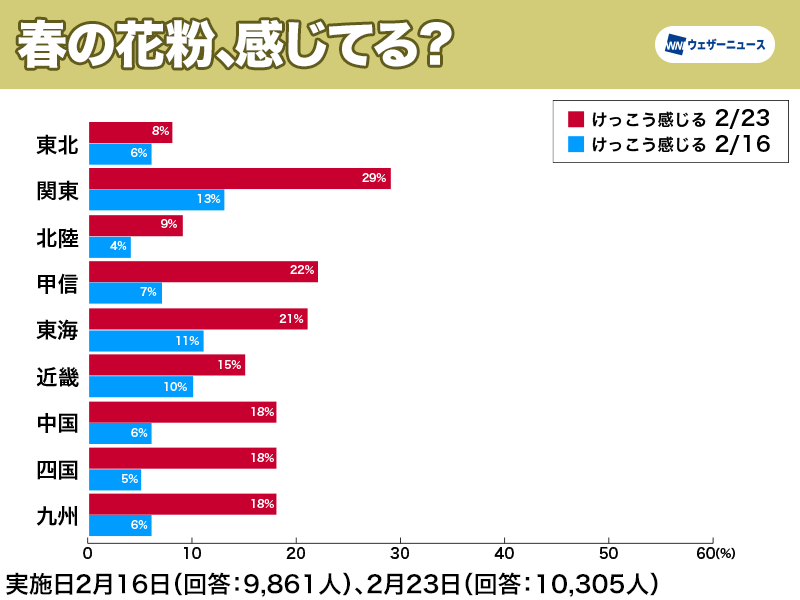 西日本や東日本のそのほかのエリアでも2〜3割の方が強く感じており、広い範囲で花粉の影響が出始めています。