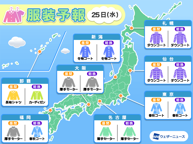 2月25日(水) 各地の気温変化と最適な服装