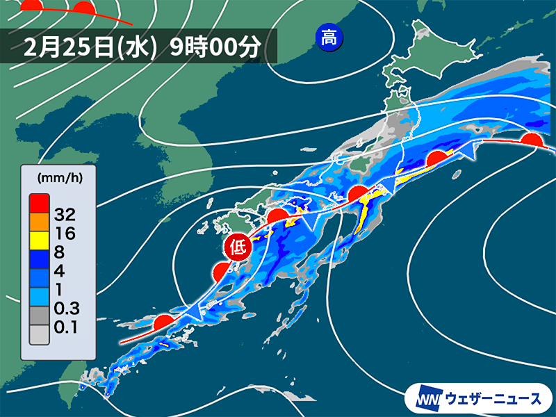 明日25日(水)は低気圧の東進に伴って、東北から九州、沖縄の広い範囲で天気が崩れます。