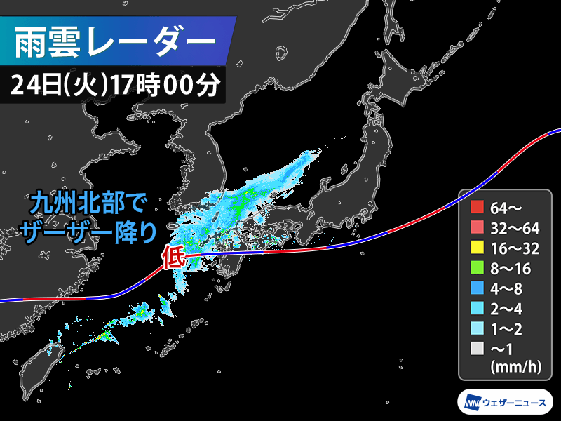 17時までの1時間には長崎県佐世保市で16.5mm、西海市で15.0mmのやや強い雨が降りました。帰宅時間帯は九州北部から山陰で本降りの雨になり、強まる所があるとみられます。