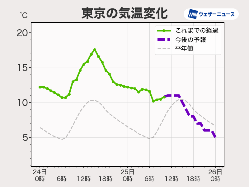 東京都心では明け方に12.1℃を観測したものの、その後は横ばいから気温が下がる傾向です。