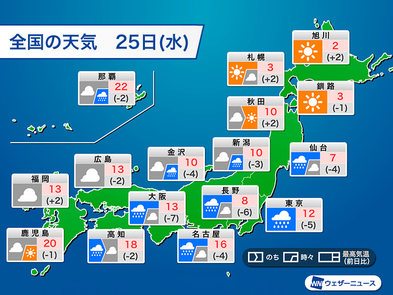 西日本の最高気温は13℃前後の予想で、日差しが少ないためヒンヤリとした体感となりそうです。