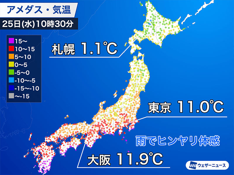 今日25日(水)10時30分の気温は、東京11.0℃、宇都宮7.7℃、仙台5.1℃、秋田5.6℃でした。関東は10℃前後、東北は5℃くらいで、寒く感じられています。