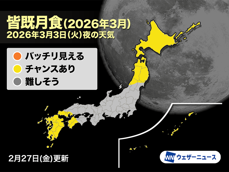 また、沖縄や奄美は寒冷前線通過のタイミングによっては、月食を観測できる可能性があります。