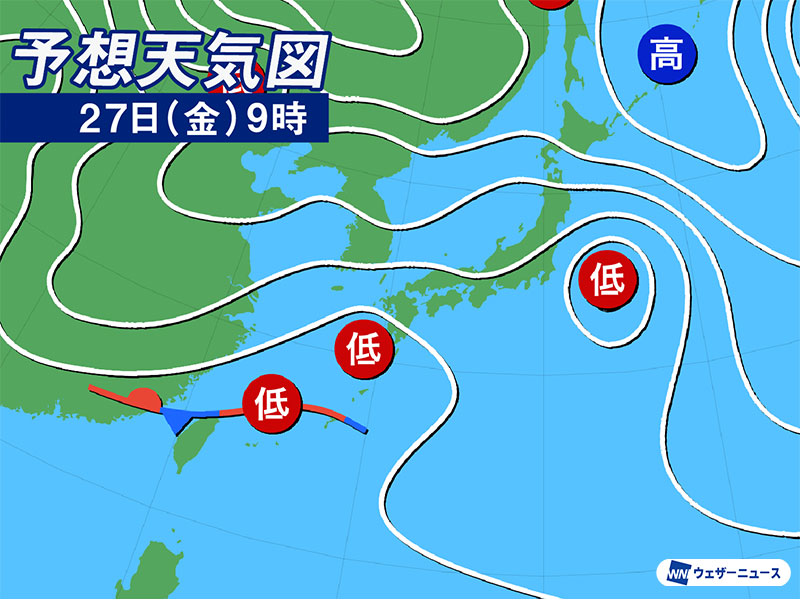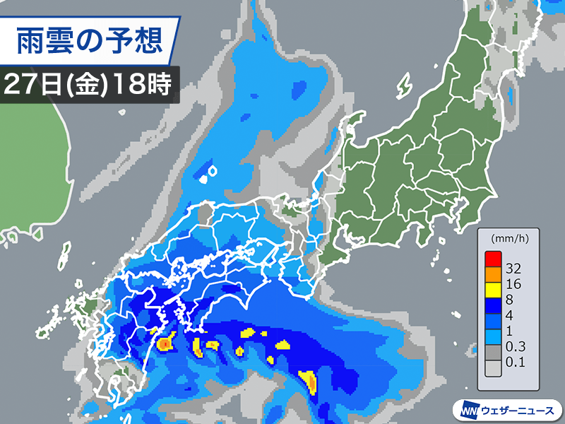 近畿でも午後以降は雨雲のかかる可能性がありますが、九州などに比べると降り方は弱い見通しです。