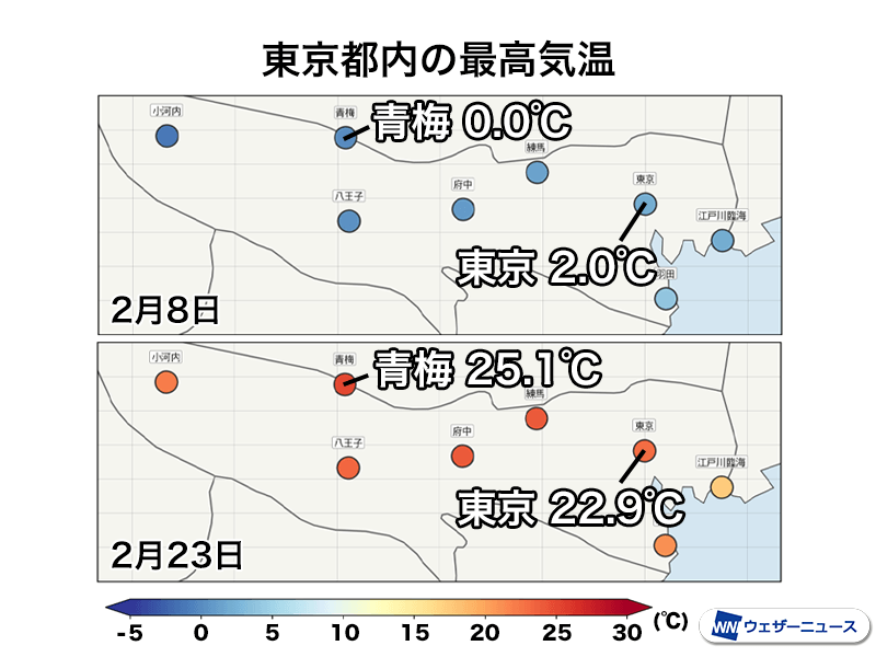 東京都青梅市では雪が降った8日(日)の最高気温が2月として最も低い0.0℃を記録。そのわずか半月後の23日(月)には2月として最も高い25.1℃を観測し、同じ月に最も低い記録と高い記録を更新しました。