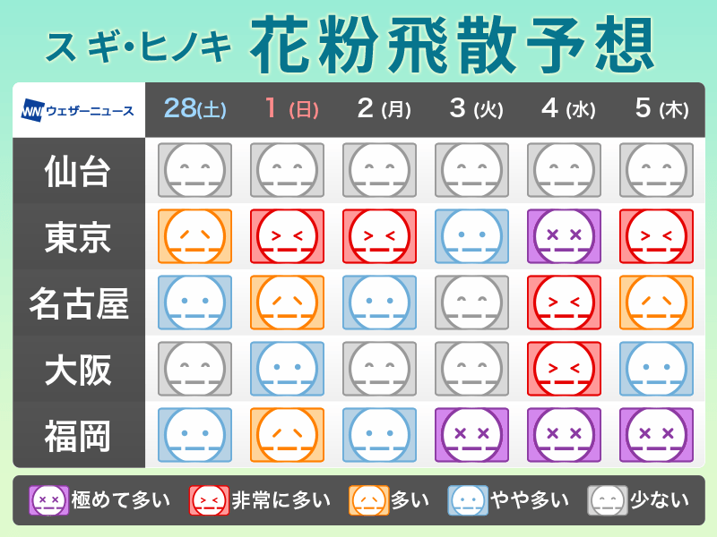 本州ではスギ花粉のシーズンを迎えています。特に雨上がりの晴天時や気温が上がる日は花粉が大量に飛散するおそれがあります。